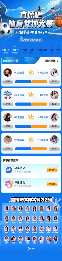 2025年『体育女神大赛』已进入32强单挑PK赛阶段,淘汰赛Day3(E组、F组)结果如下: