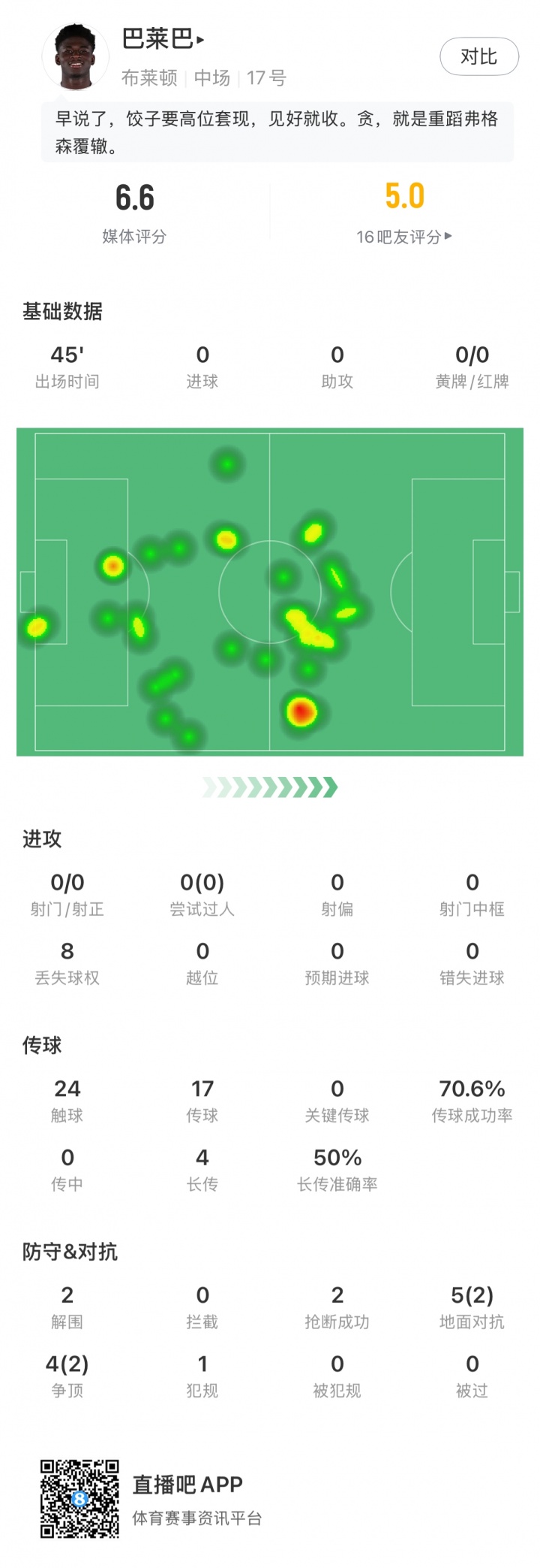 对阵热刺的比赛后,赫尔泽勒表示巴莱巴下场是因为球员感觉很疲惫,某些时刻表现很挣扎,他还补充说,巴莱巴无法及时回防而且状态不佳。