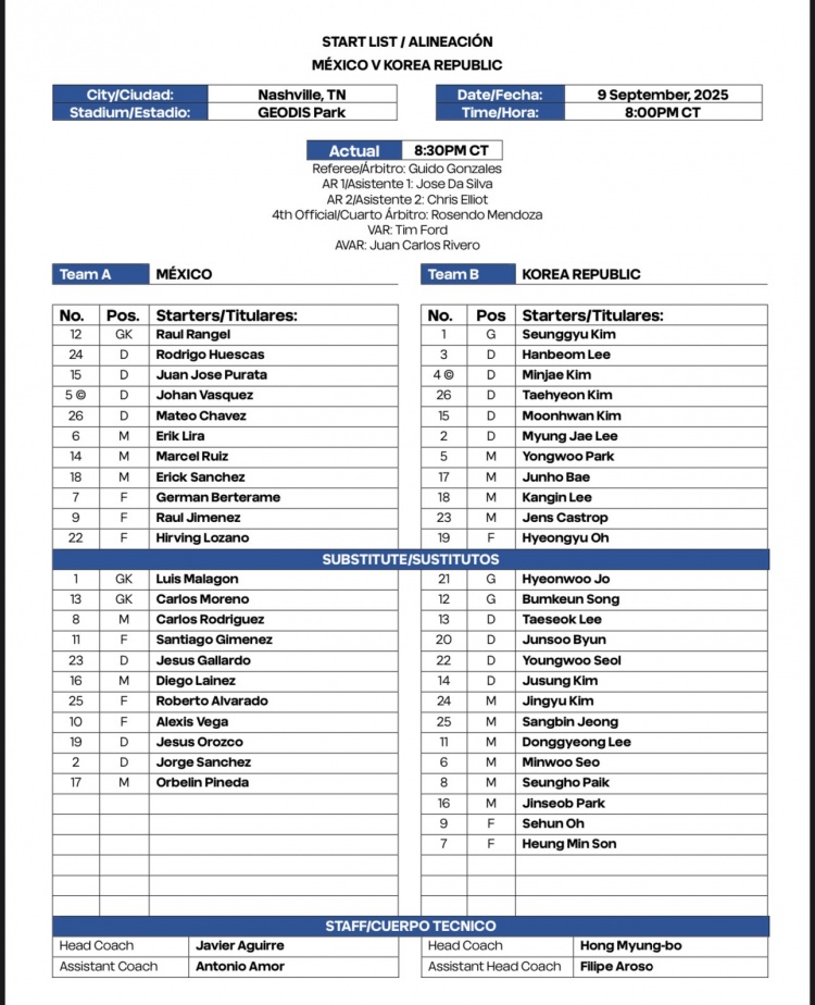 9月10日讯 北京时间今天9点30分,墨西哥将在友谊赛中对阵韩国,两队首发名单出炉。