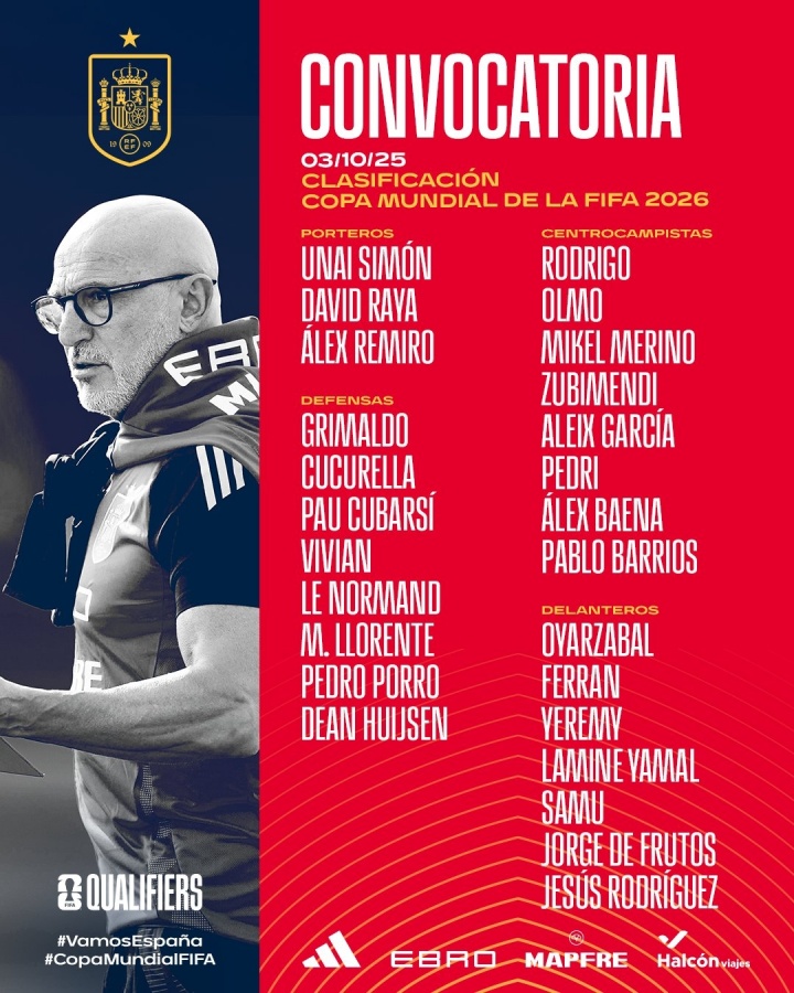 西班牙世预赛名单:亚马尔、佩德里入选,赫伊森、苏维门迪在列